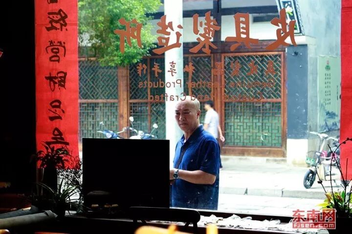 在福州三坊七巷光禄坊路上,福工皮具制作所就是何巍工作所在地,时常有游客在窗口前驻足。