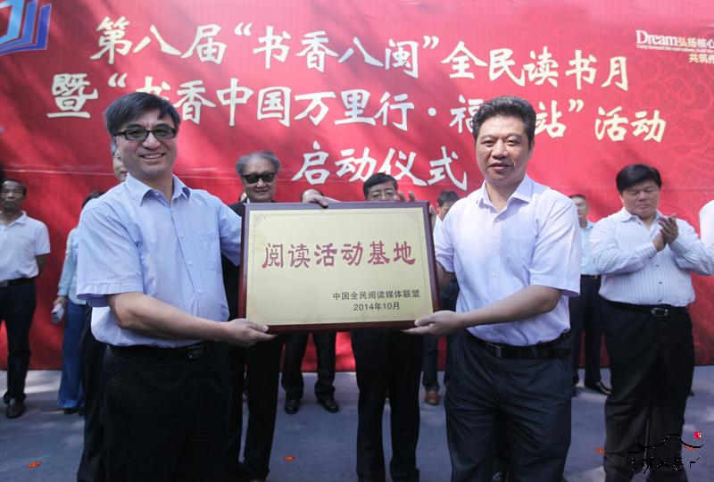 中国新闻出版传媒集团董事长马国仓为福州市全民阅读活动领导小组赠送“全民阅读媒体联盟活动基地”牌匾