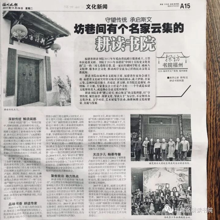 除“掌门人”外,耕读书院还团结了众多专家学者,一起来做传统文化的传承和宣传工作。2013年策划了一套多卷本的《三坊七巷文化丛书》,包括《坊巷世家》《坊巷名居》《坊巷俊彦》《坊巷雅韵》《坊巷翰墨》等,后由闽都文化研究会印行;2015年,卢美松、黄启权、陈章汉、杨际岚、赵麟斌、张善文、王炳根、杨健民、何强、林焱等人在耕读书院举行了一场“文化遗产保护与文化传承耕读沙龙”;今年与闽都文化研究会、福州电视台《福文话》栏目携手开展有福之州的福文话——文化名家访谈,卢美松、陈章汉、林焱、唐希等专家齐聚耕读书院,共话福文化……