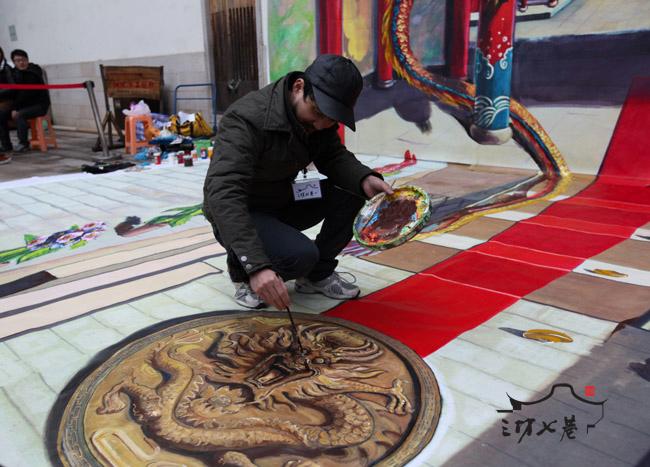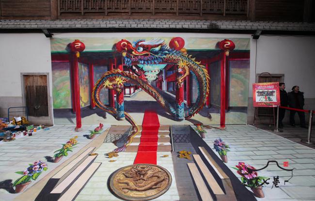 正如今年的龙年邮票一样,本次设计在三坊七巷展出的龙也特别的霸气十足。“祥云江浪,金龙盘旋而踞,龙腾四海,气吞山河”。延续2011年3D立体画展示活动所取得的热烈反响,2012年正月初三到初五,福州光禄吟台展示主题为“龙跃三坊 春满七巷”的3D立体画。画的立面是一条色彩斑斓的彩色金龙圆目露齿,吼声似乎在耳,盘旋红柱而出.金龙长度为12米,寓意为2012年龙年。画面延伸至远处为古韵坊巷,地面上红色地毯从门里延伸出来,近处地面为春暖花开的天井, 天井里有散落的财宝和金色盘龙,寓意“恭喜发财”,游客嘻戏其中,金龙触手可及,仿佛穿越于天上人间。