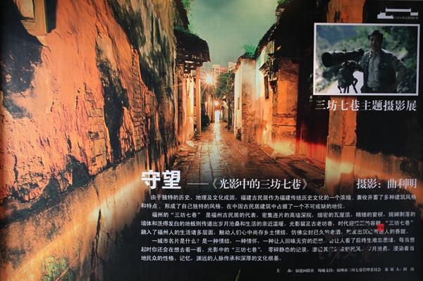 今日上午,由福建画报社主办的“三坊七巷主题摄影展”将在福州三坊七巷宫巷举行,首期展览将持续到2012年1月10日,内容为福建画报社副社长、副总编辑曲利明的“守望——光影中的三坊七巷”,欢迎市民免费参观。