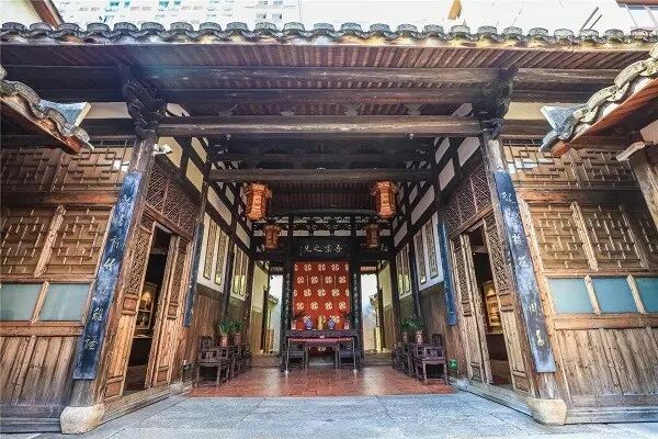 严复故居,占地600多平方米,坐北朝南,门上匾额书写四个鎏金大字——“严复故居”。两侧马鞍墙探出蜿蜒而高耸的巷墙,入口内凹,显得谦虚而不失威严。檐口均施瓦当滴水,挑檐穿枋上叠做雕刻精美的轩架,这在三坊七巷中并不多见,显得富丽而不失稳重。单从故居的入口就能看出主人家儒雅脱俗的风度与气韵来。
