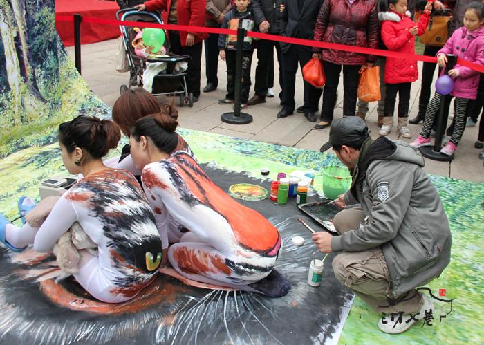 图腾坊巷彩绘人生元旦迎新3d地画展示,1-3日,一项与上帝争宠的艺术—3D人体彩绘,给了人们无限的想象空间,以三坊七巷的建筑及森林之王来绘制,突出文化和艺术气息的图案分别展示于模特身上,给游客们视觉和心灵上一次强大的冲击力。