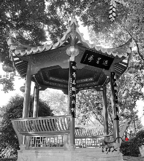沁园为假山构筑,在光禄吟台前。郭柏苍于光绪七年(1881年)挖漾月池,取土筑假山,假山层累曲折,植松竹梅杏李木62株。假山之巅今新建一座凉亭,亭六角、木构,名曰:“追昔亭。”(图四)追昔亭原在光禄吟台西侧,系郭柏苍于光绪八年(1882年)为祀光禄卿、知福州事程师孟而建造;郭柏苍《追昔亭》诗:“读遍名山石上文,吟台清兴更凌云。万株手植无人忆,我独瓣香忆使君。”