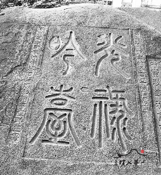 吴弦于民国18年(1929年)榜书:“半潭秋水,一房山。”胡氏于民国35年(1946年)榜书:“山不在高。”卢兴荣等题刻:“适子馆。若浮都转属题,氿谿卢兴荣。”