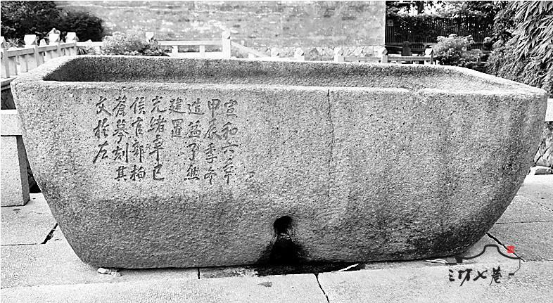 光禄吟台前现存一口长约268厘米,宽105厘米,高42厘米的宋代石槽(石盆)(图二),此石槽当为李作梅所得闽山保福寺石盆,槽边镌刻“宣和六年甲辰季冬造盆,了然建置。光绪辛巳侯官郭柏苍摹刻其文于左。”所谓“摹刻”,即郭柏苍挖漾月池时出土法祥院了然和尚建置的石槽,槽外壁镌刻的“宣和六年甲辰季冬造盆,了然建置”之字已漫灭,遂摹刻其文于槽之左外壁。
