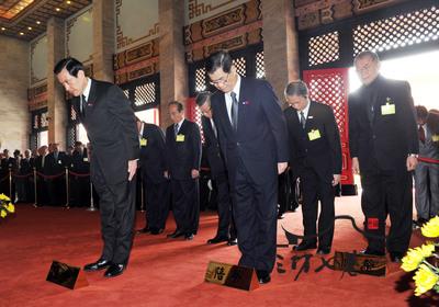 台湾当局领导人马英九(前左)在台北出席春祭典礼,向先烈鞠躬致祭。图片来源:"中央社"