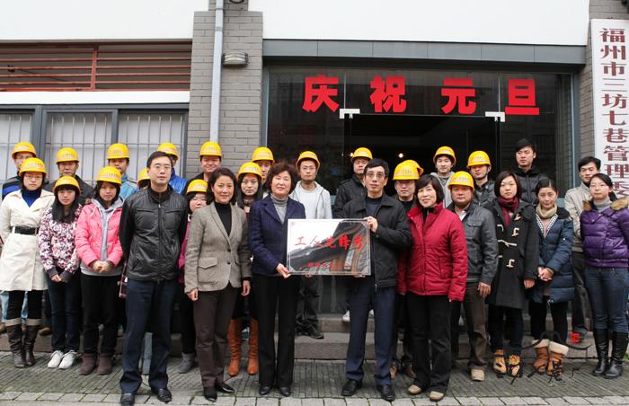 1月10日,三坊七巷管委会文保工程部喜获福建省总工会授予的“工人先锋号”荣誉称号。福州市总工会傅春英副主席为文保工程部颂发了“工人先锋号”奖牌。她表示受表彰的单位需再接再厉,不断创造新的业绩,要以先进为榜样,热爱本职、钻技术、创新管理、以饱满的劳动热情和创造活力投入福建发展和海西建设之中,为实现我省“十二五”规划的宏伟目标贡献智慧和力量。