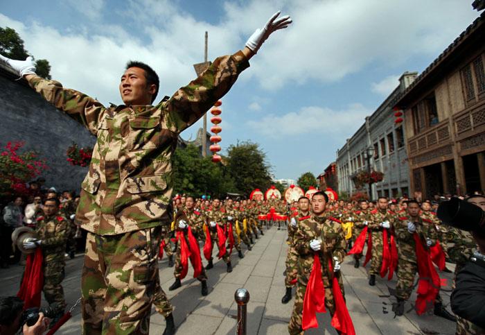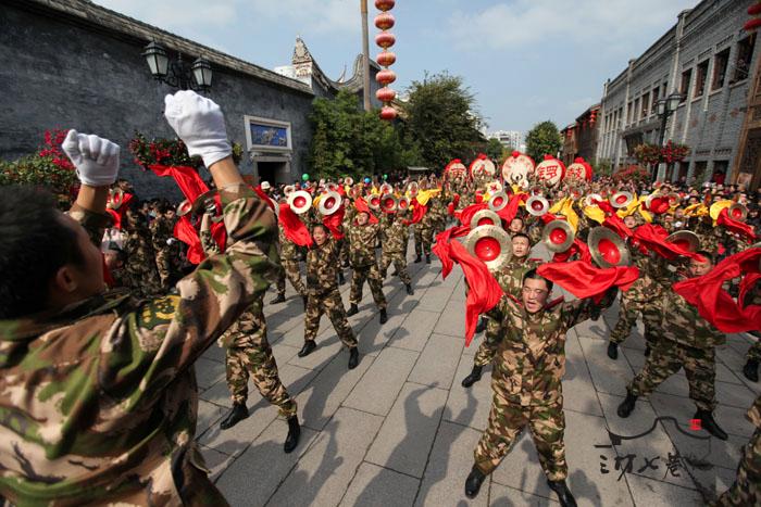 1日上午, 武警福州支队的威风锣鼓队将再次敲响新年的钟声,为游客们带来听觉与视觉上非一般的冲击及享受。一群英姿飒爽的武警官兵抡开双臂,敲出了人们心中的喜悦。鼓声和着锣声,以及武警官兵们的呐喊声使得在场的每一个人激情澎湃,在三坊七巷他们用喜庆的锣鼓表演迎接新年的到来。
