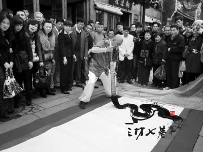 “笔墨伺候!”只见现场一条十米长的红毯摆在南后街的街道上,上面铺着一张五六米长的画卷,里里外外围了三圈观赏的市民。陈大师拿着一支巨型毛笔挥毫泼墨,一气呵成。与其说写的是一个“龙”字,更像是一只欢腾的飞龙正在画卷上翻腾。