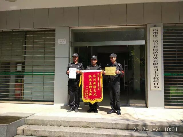 今天上午,台江区苍霞街道和中平社区来到三坊七巷保护开发有限公司上下杭项目部,对4月21号凌晨扑灭中平社区火险的保安队员授予锦旗及感谢信!并对物业公司表示感谢!