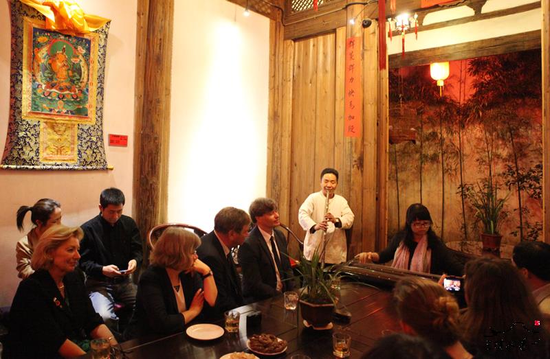 为了欢迎德国莱法州州长、德国伯力斯伯爵及夫人,绥安会馆里进行了古琴演奏《酒狂、高山流水》,古琴与萧合奏《阳关三叠》等演出,在场来宾饶有兴致地认真聆听了整场音乐会,并时不时发出赞叹。