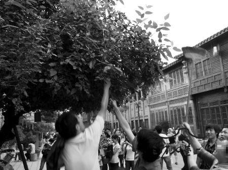 昨日,五一&小长假第一天,福州三坊七巷景区迎来八方。但令人遗憾的是,记者看到不少游客在尽兴游玩的同时,似乎忘记了旅游文明。一群游客在三坊七巷景区采摘桑葚,其中一名游客还拿起扫把当工具。