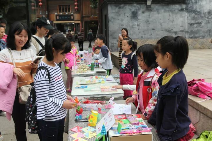 最早开张的是三年级小学生黄子妍的摊子。她的摊位上摆满了各式小布绒玩具和书籍、笔记本等小物件。一位被活动热闹场面吸引来的女游客看上了黄子妍摊位上的一件小玩具和一本精美的笔记本。黄子妍收钱、找钱,并将售出的物品、金额详细地记录在记账本上。顺利开张,让小摊主信心满满,更起劲地吆喝起来。