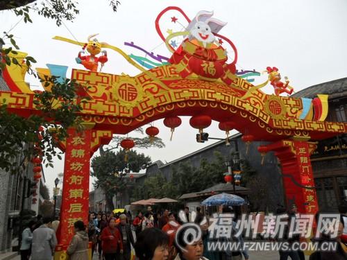 昨日下午,记者来到南后街,两个红色的大拱门已经矗立在杨桥路和吉庇路的两个入口处,拱门上方一群喜气洋洋的兔子在提醒着来访的游客,离元宵节不远了。