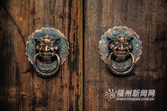 三坊七巷里或新或旧的铺首大约20余对。小的仅有几厘米,大的超过一个巴掌,它们大多都是面目狰狞的兽首,血口衔环,双目滚圆,怒视前方。因为铺首为兽面,铺首叼着门环,因此古人又将之称为“兽面衔环”。“兽面衔环”成了三坊七巷门环文化的典型。