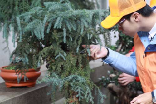 志愿者在修建园林植物中的枯枝残叶