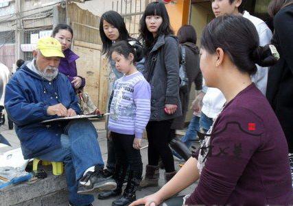 头戴一顶小黄帽,穿着件风衣和牛仔裤,一位胡须花白的老人,在街边角落坐着,眼睛时而专注看着前方,时而埋头挥舞手中的画笔。只七八分钟,一张人物肖像画成了。拿到画像,有人喊着“真像”走了,也有人默默离开。“即使不像,也很少听到有人抱怨,这是大家看在我白胡子面上。”老人打趣。