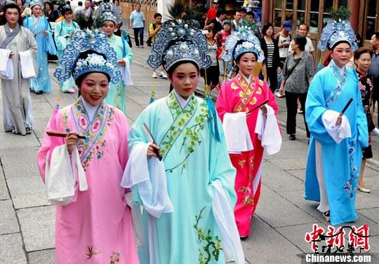 图为当日9位身着戏装分别扮演梁山伯、祝英台的“越友”演员在福州三坊七巷集体亮相,吸引众多游人市民的目光。中新社发 刘可耕 摄 10月7日,“双节”长假的最后一天,由福建省芳华越剧团和福建省越剧之友联谊会共同打造的越友版《梁山伯与祝英台》剧组人员在福州三坊七巷举行公演前的推介展演活动。参演该剧的来自福建省越剧之友联谊会的22名演员,大多是“70后”、“80后”的年轻女性,来自各行各业。