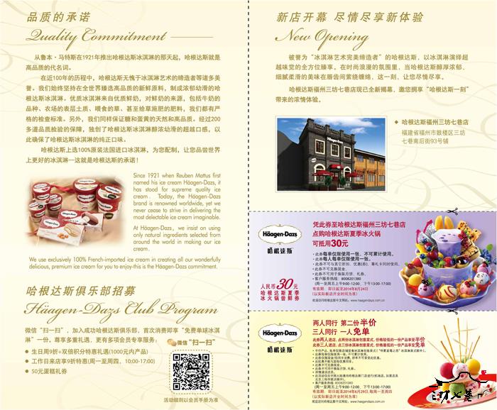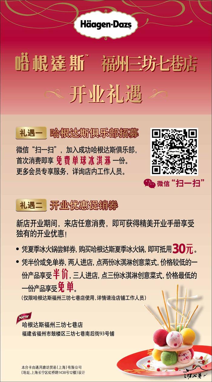 哈根达斯福州第4家店三坊七巷店将于6月12日优雅揭幕。在这个盛夏时节,带上心爱的她,一起品味哈根达斯带给您的这份甜蜜与冰爽!6月12日起至6月29日,每周一至周四期间,双人行一人半价及三人行一人免单等开业活动,为您的炎炎夏日带来更多冰霜与清凉。 更多新店优惠活动请与店内咨询。 (地址:福州市鼓楼区三坊七巷南后街93号铺)