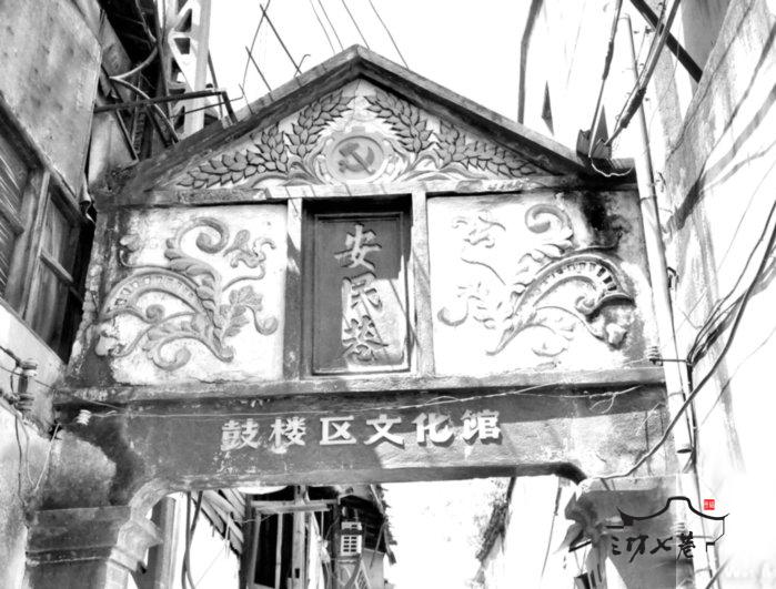 塔巷东面的牌坊,原来顶部有一座灰色小塔,塔下是绿色琉璃瓦、红色承梁,下面是白色水泥柱,颜色很鲜艳。安民巷的东面老牌坊现在还在,三角形的尖顶上雕刻着金黄稻穗围绕齿轮的图案,齿轮中间是红色的镰刀锤子,下面的一条大红横梁上写着“鼓楼区文化馆”字样,这个牌坊既是巷子入口,也是文化馆的招牌,整体的红黄蓝三色很鲜艳,具有上世纪六七十年代的风格。