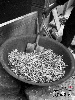 小竹钉都削好,就可以用火炒了。这个步骤是要炒干水分,防腐防虫,而且竹子会更硬,容易钉。为了不炒糊,铁锅里还要放沙子。翻炒一个小时左右,竹钉变黄,相互碰撞时发出清脆的声响,就可以出锅了。