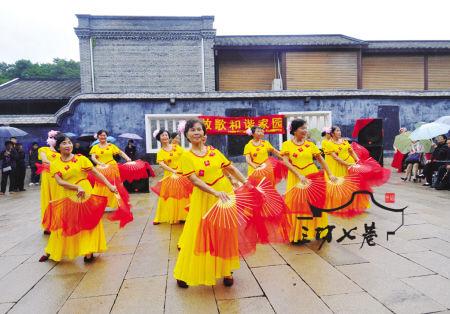 细雨中,伴随着《家乡美》的乐曲,12个穿着花衣的依姆,翩翩起舞,雨水冲花了鲜艳的妆容,她们依然跳得非常投入。这是前天下午2:30左右,福州闽发西湖广场文化娱乐队的依姆们,冒着大雨,在三坊七巷光禄吟台演出。演出的有舞蹈《中国红》《家乡美》,还有一些传统的越剧曲目。