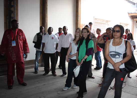 图为外国友人参观水榭戏台