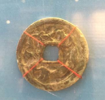 民俗钱展板中有一枚钱币圆形方孔,上面刻着两只狐狸一条龙的图案,意在提醒当时的皇帝切莫像商纣王一样贪恋女色,耽误了国事。
