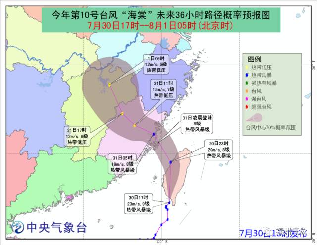 【2017年7月30日19时最新动态】今年第10号台风“海棠”今天19时中心位于北纬22.7度、东经120.5度,台湾省屏东县境内,近中心最大风力9级, 23米/秒(约83公里/时),将以每小时30公里左右的速度向偏北方向移动,强度将略有减弱。