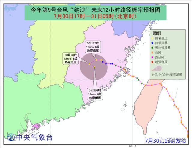 今年第9号台风“纳沙”今天17时中心位于北纬26.1度、东经117.8度,福建省三明市境内,中心最大风力6级, 12米/秒(约43公里/时),将以每小时5公里左右的速度向南偏西方向移动,强度逐渐减弱。