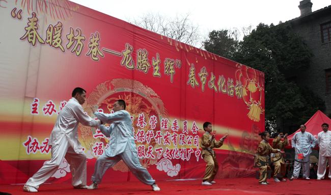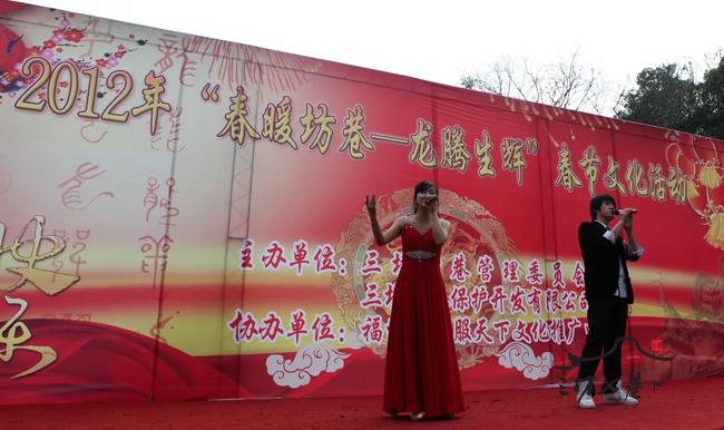 1月27日下午,三坊七巷光禄吟台的“福州民间春晚”吸引了众多游客驻足观看。福州的喜娘、闽剧和福州话歌曲等都轮番登台亮相。现场工作人员说,多数中国人已经习惯了大年三十看央视春晚,但真正民间的东西很难登上央视的舞台。我们搞民间春晚,就是想让老百姓欣赏到原汁原味的非物质文化遗产。