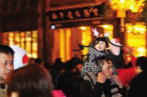 昨晚想走进三坊七巷,从北口进去,在门外就得站好位置,否则挤进人群容易走散。记者从东街口天桥方向进入南后街,是小心翼翼“挤”过来的,顺着观灯的人群,从北口到南口,花了近半小时才走完。