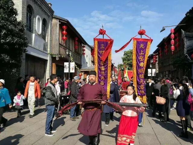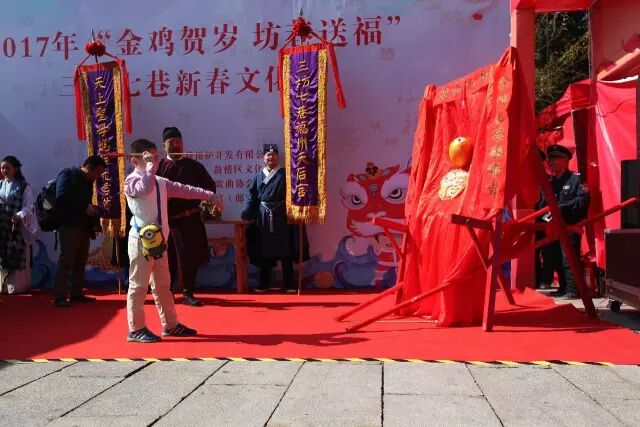 三坊七巷天后宫内钟鼓齐鸣,身着传统礼服的仪仗、幡旗、锣鼓阵头列队经南后街到达光禄吟台,红红火火闹新春。