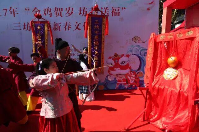三坊七巷天后宫射艺队示范射好运金蛋。金花四射,象征好运纷至。