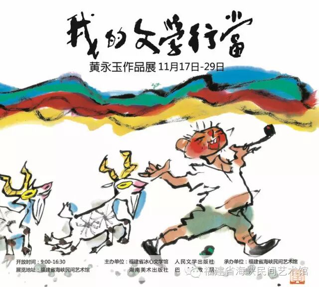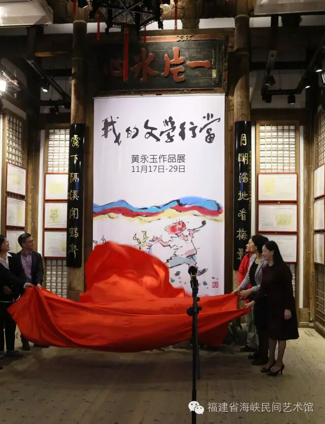 一名九十多岁的老顽童,他是画家,还是雕塑家、诗人和作家。他年轻时以线条粗犷、刀法奔放的版画赢得赞誉,后来又以别具一格的国画名扬四海,而那些诙谐幽默却不失哲理的漫画更是发人深省。其油画方面的成绩,也丝毫不比版画、国画和漫画逊色。而在这些领域当中,文学似乎才是他生活里面的第一位,字里行间透彻着对生命的领悟,他就是黄永玉。“浮漾在他粗犷的线条间的正是童稚、喜悦和奔放。”用于形容黄永玉的画作恰如其分,而这些特点也同样展现在黄永玉的文学作品当中。黄永玉被称为一代“鬼才”。他博学多识,诗书画俱佳,亦是杂文、散文、小说、剧本的大家,出版多种画册,还有著有《永玉六记》《醉八仙》《吴世茫论坛》《老婆呀,不要哭》《这些忧郁的碎屑》《沿着塞纳河到翡冷翠》《太阳下的风景》《无愁河的浪荡汉子》等书。画过《阿诗玛》、生肖邮票《猴》和毛主席纪念堂山水画等。在澳大利亚、德国、意大利和中国内地、香港开过画展,其美术成就曾获意大利总司令奖,在海内外享誉甚高。“我的文学行当”——黄永玉作品展,展览的作品全部围绕着文学展开,诙谐有趣、富有深意,是黄永玉对生活的真实感悟及其个性的真切呈现。本次展览由福建省冰心文学馆、人民文学出版社、湖南美术出版社、巴金故居主办,福建省海峡民间艺术馆承办,《人民日报》高级编辑、首届鲁迅文学奖获得者李辉先生、福建省文联办公室主任郭平女士、福建省作家协会秘书长林秀美女士、《福建文学》杂志社社长曾章团先生、福建省冰心文学馆馆长、福建省海峡民间艺术馆馆长刘东方先生、巴金故居副馆长吕争女士等嘉宾出席了开幕式。展览围绕文学展开,由“太阳下的风景”、 “罐斋二重唱”和“流不尽的无愁河”三部分组成,展出黄永玉文学手稿、版本、绘画等不同样式的作品100余件,并将在福建海峡民间艺术馆持续展出至2016年11月29日。《人民日报》高级编辑、首届鲁迅文学奖获得者