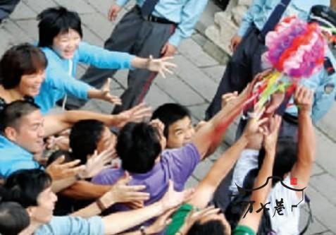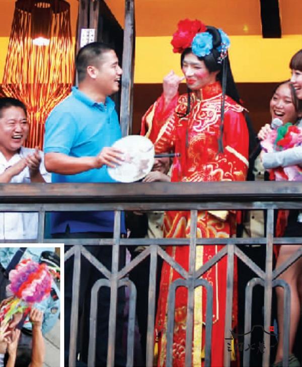 凤冠霞帔,红布遮头。当新娘伸手擎起花球抛下,楼下的人群欢腾起来,最后绣球被一个男青年紧紧抱住。 人群开始起哄,这名男青年快步跑上二楼,一掀盖头,哎呀!一张阳刚的脸上,两团股红的胭脂印。 “哗”人群里爆笑昨日福州三坊七巷里精心策划了一场玩笑,让游客收获了意外的快乐