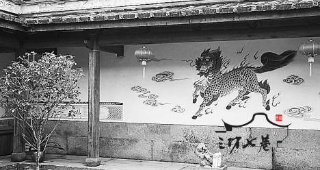修葺一新、位于宫巷的林聪彝故居,已正式对外开放。这是一座始建于明代、兴盛于清朝的福州传统民居,占地面积近3000平方米,坐北朝南,四面风火墙,临街十扇大门。是明、清时期福州最大的豪宅之一。四进四花厅,雪洞假山、亭台楼阁,各进之间隔以高墙,过道用覆龟亭遮雨。整座建筑雕梁画栋,气势恢宏。意外的是主座第一进南面照墙上,却少有地画了一只独角高额名曰獬豸的神兽而不是常见的麒麟(见图)。
