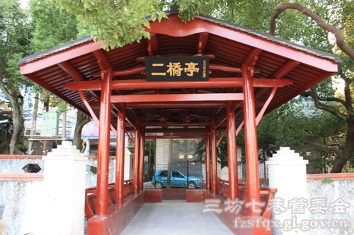 二桥亭桥:作为琼河七桥之一,二桥亭桥是福州市区内保存至今惟一建有风雨亭的木构古桥。桥建于清代,重建于1986年,全长9.8米,宽3.2米,跨度4.1米,桥梁由十二根木柱架成,桥面原铺木板,现为水泥替代,桥上建亭式桥屋,穿斗式构架,桥屋三开间,卷棚顶,用柱8根,远望像个“介”字。