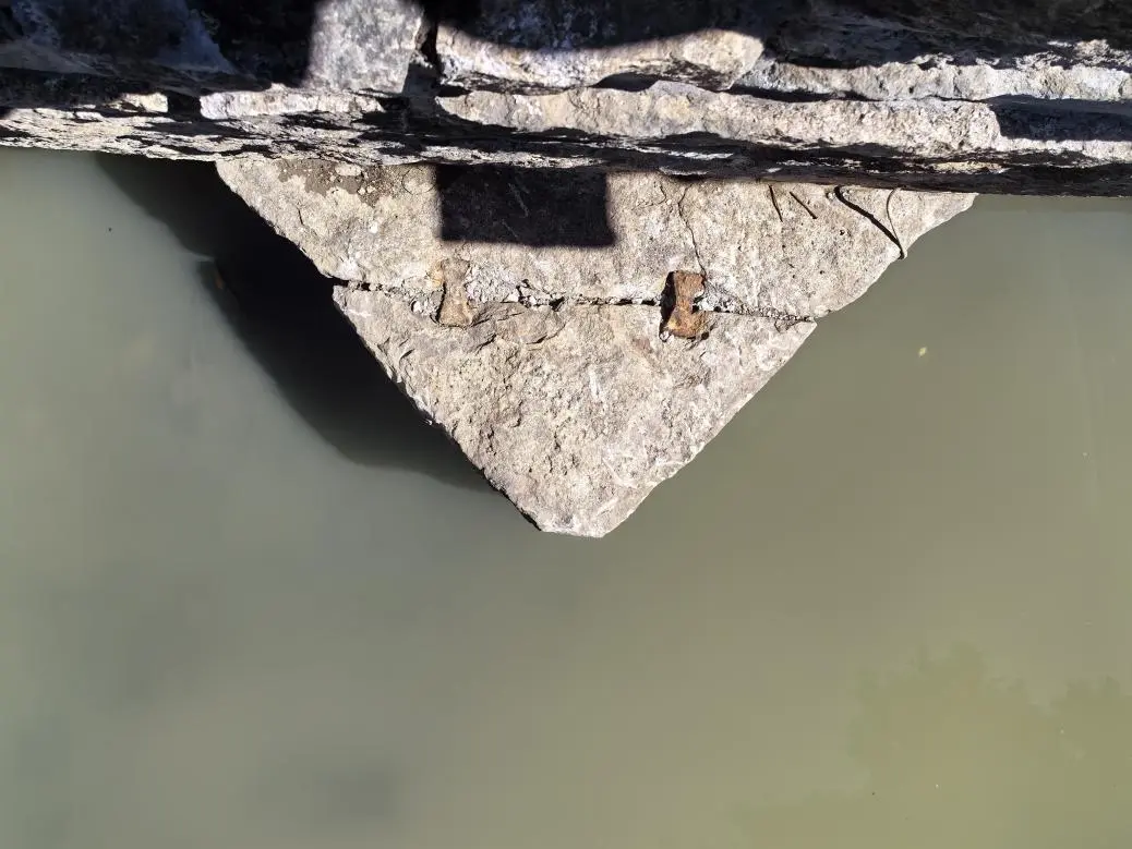 寄生榕树根系清理后,星安桥的石拱券完整地展现了出来。整座石桥以花岗岩砌筑,拱券内密布条石,在场人员无不惊叹于古人营造桥梁的精湛技艺。同时,还发现石桥两大铁活使用方式:一是在梯形状条石之间大量使用铸铁打造的铁锲;二是在船形墩分水尖的石板之间使用生铁打造的银锭榫,以增强石块之间的稳定性。