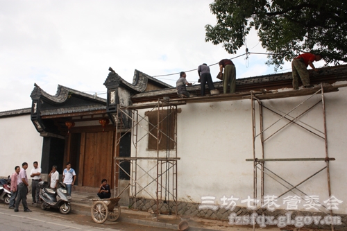 铺斗底砖的工人正蹲在地上把砖块摆齐,做花格窗的大叔正在把木条和水泥支撑的格子一层层摞起来,木匠们正用锯子锯着木条……铁锤的“砰砰”声、电钻的“嗡嗡”声、锯子的“吱吱”声不绝于耳。