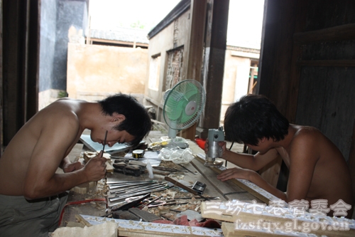 陈建先的旁边,3名组员正在给一段梁木雕刻扇形吊兰。组员兰龙辉介绍,一段梁木两边都要雕,每边3个扇形吊兰。小兰雕刻的吊兰已经进入画线条阶段了——即给花瓣和叶片画上细细的脉络。他先用小号的平刀把花朵、叶片细细地打磨光滑,再用三角刀在花瓣上刻上深浅不一、粗细不均的几条细纹,反复6次之后,一朵盛开的花儿呈现在记者的面前。