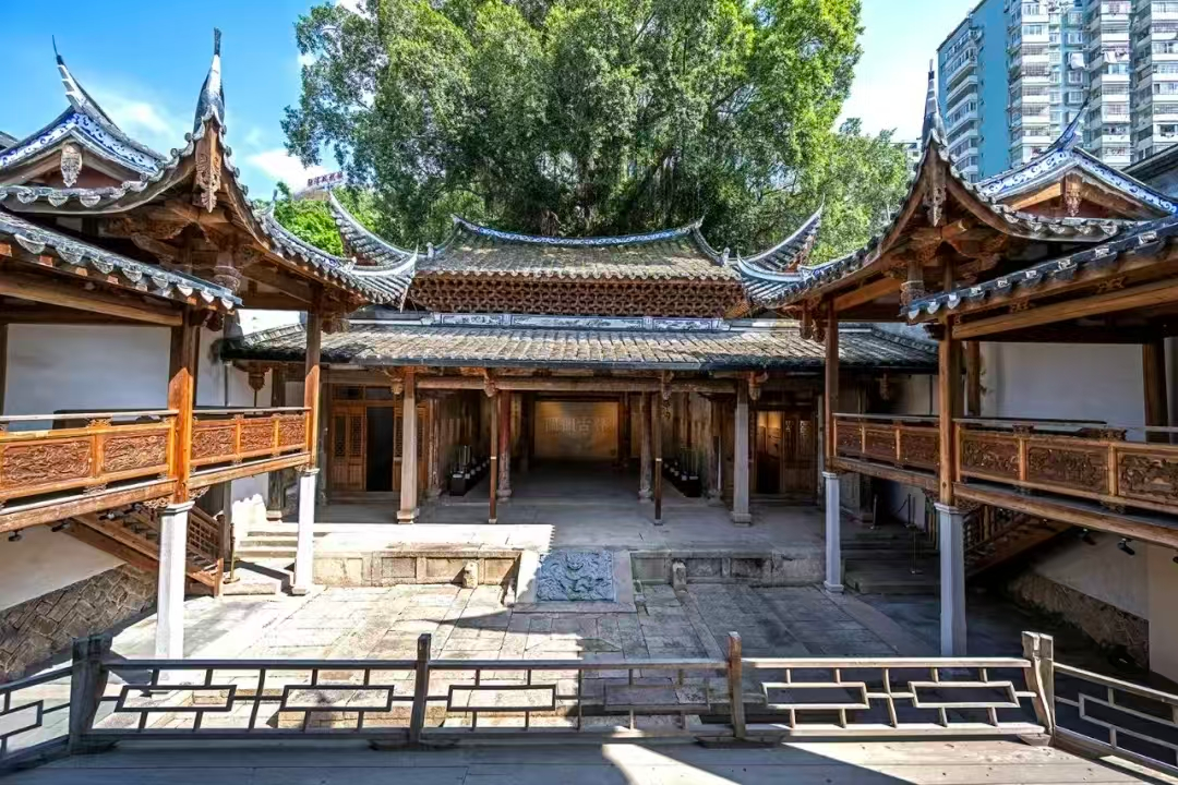 场馆介绍:建郡会馆坐落于上杭路128号,建于清嘉庆年间为建宁府商帮集资建造,供同乡聚会或寄宿,现为福州市级文物保护单位。会馆坐北朝南,占地面积2482平方米,面临上杭街,背倚彩气山,依山势而建。正面红砖清水门墙,石框大门上题有“建郡会馆”“天后宫”两块匾额,两侧是两扇小拱门,门头题有“海晏”“河清”。上建神龛式的牌楼,翘角的房檐下是蓝底的浮雕,整个建筑古色古香、雄伟壮观。