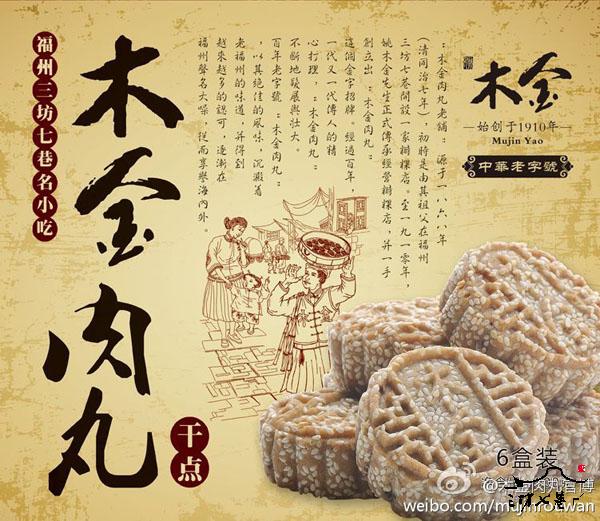 肉丸,本是福州民间春节时的传统食品,已近千年历史。过去肉丸的一般制法是取白芋刨成丝,加薯粉、肥肉、红糖汁拌匀,放入铺有荷叶的甑中蒸熟而成,每甑都在5公斤左右。木金肉丸则有较大的改革发展。姚木金,闽清人,其祖父于清咸丰间来福州米时粿业当学徒,出师后在澳门路营房里开小店,专制肉丸出售。他受莆田碗糕的启发,把肉丸改成一小团——小团,吃时比以往方便。传至木金的父亲,营业所得依然仅足糊口。民国10年(1921年)木金接手,为了改变口味,增加配料,采用芋头、薯粉、肥肉、红枣、芝麻、白糖等为原料,蒸成小碟状,加上卤汁,内包甜咸可口的肉馅,甜中有咸,咸中有甜,肥而不腻,香喷可口,风味独特。不仅味好,而且色也好,如琥珀,似玛瑙,人见人爱。木金还改善销售方式,从坐等改成叫卖。路人听到市声“木金囥馅肉丸真好吃”,“好吃好吃也好吃”,争相购买。久而久之,流行福州城内街头巷尾,不少名厨、菜馆也向他定购作为酒席上的点心,直至香港、台湾和东南亚都有名声。木金肉丸以选料严格,制作精细,至今福州老食客还赞不绝口。木金于1956年去世,其子姚依盘继承,现已传至其孙。