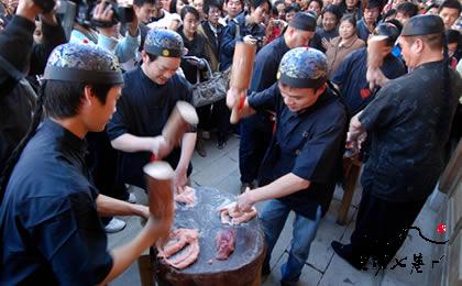 据传明嘉靖年间,某御史告老还乡,家中一位厨师无意中创出此食品。燕皮的做法是,取猪腿的瘦肉(蹄戈),用木棒反复千百遍捶打。打时,在一个垱位上,或一人独打,或二人对打、三人同打,噼啪噼啪,节奏分明,若二三人配合默契,煞是好听。打成肉泥后,掺进适量的甘薯粉,再擀成薄如纸片,称为燕皮。燕皮有多种吃法,最通常的是切成三寸见方,以它为皮,内包咸味肉馅,捏成肉饺蒸熟,因形似飞燕,故名扁肉燕,随时可以高汤煮吃。扁肉燕和鸭蛋一起煮汤,就是“太平燕”,美称“太平长春”,是福州民间酒席上的一道“大菜”。第二种吃法是把燕皮切丝煮汤,调以酸辣,为燕丝汤;第三种是把燕丝切细,将制好的肉丸,放在上面沾滚,蒸熟,成为燕丸。