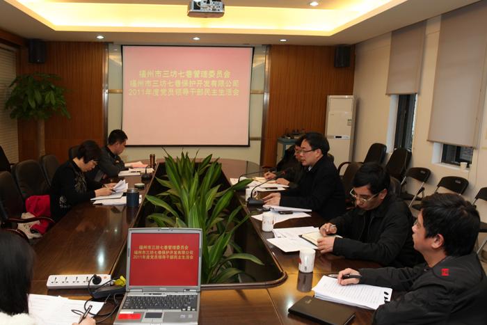 1月10日下午,三坊七巷管委会、公司党支部根据省纪委、省委组织部《关于转发中央纪委、中央组织部〈关于以“坚持以人为本执政为民理念发扬密切联系群众优良作风”为主题开好2011年度县以上党和国家机关党员领导干部民主生活会的通知〉的通知》要求,组织召开了2011年度党员领导干部民主生活会。会议由鼓楼区委书记、三坊七巷管委会主任林飞主持,三坊七巷保护开发有限公司总经理林矗传达了会议精神,管委会领导班子参加了会议。