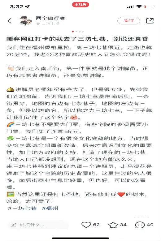 文化讲解志愿者们的服务受到了市民游客的一致好评,更有网友@两个旅行者发文称赞资深志愿者讲解员——于仲佳老师,讲解经验丰富,让他们在游览之余了解了三坊七巷名字的由来,还和老师一起探寻了宅院背后的故事等,给他们此次的出行带来了惊喜。