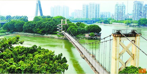 从龙潭角通往江心公园的铁索桥是市区目前唯一的一座铁索桥,1992年9月建成,全长247米,主桥跨径150米,桥面宽4.5米。“没有铁索桥时,人们进出江心公园就靠轮渡。”守园人说,由于年久失修,公园的简易环岛驳岸已多处坍塌,铁索桥也需要维修。