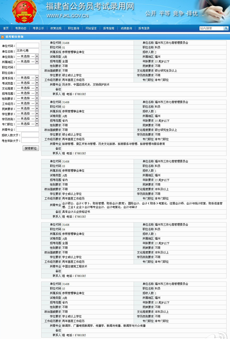 福建省2012年度秋季考试录用公务员公告——福州市三坊七巷管理委员会