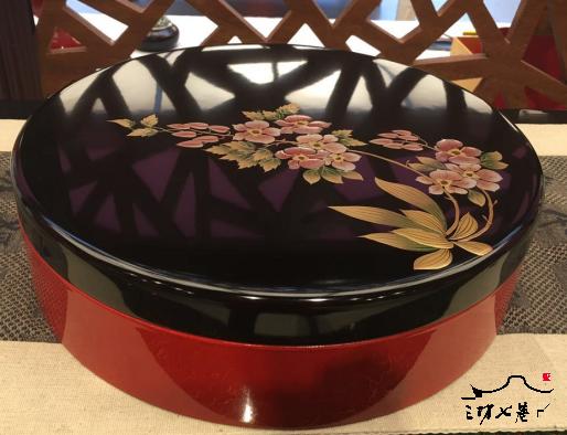 4 | 圆形果盒 | 300*80(直径*高度), | 使用大漆涂料,胎体为木质,底座为红色,盖面为黑色,内部带隔层,上盖表面图案以指定莳绘图案进行表现